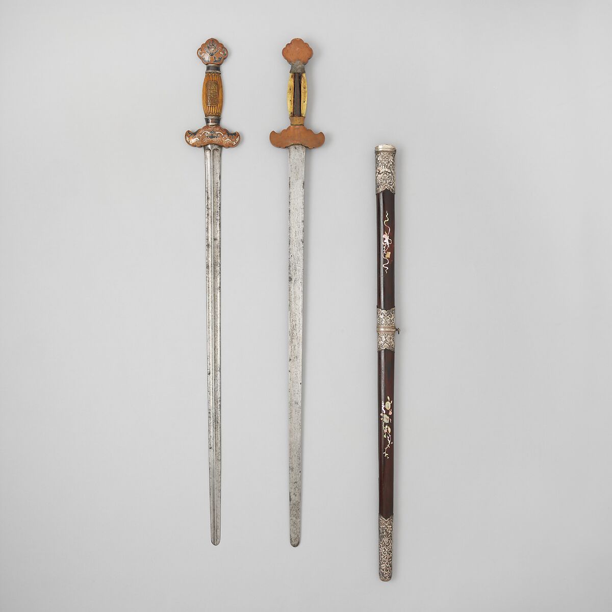 - Dimensions: L. with scabbard 34 1/2 in. (87.6 cm); L. of each without scabbard 32 5/16 in. (82.1 cm); L. of each blade 25 5/8 in. (65.1 cm); W. 3 1/2 in. (8.9 cm); Wt. of sword (a) 15.8 oz. (447.9 g); Wt. of sword (b); 13.9 oz. (394.1 g); Wt. of scabbard 8.3 oz. (235.3 g)