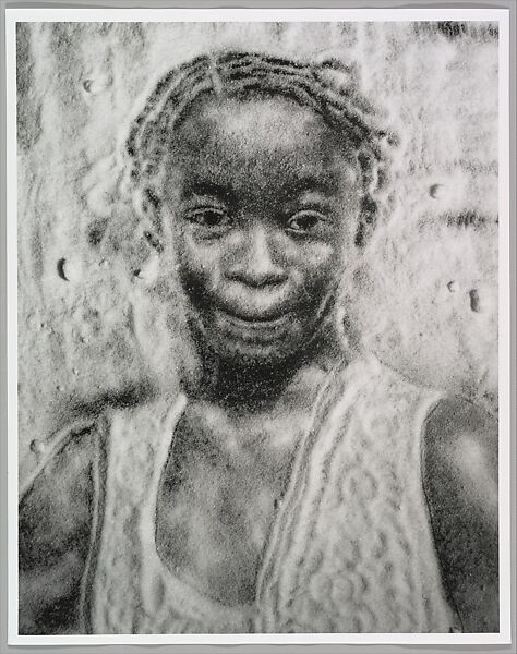 For the Sugar Children series, Muniz took pictures of local children while on vacation in the Caribbean. Upon returning home, he worked from the snapshots, creating likenesses by pouring and arranging sugar on black paper. The artist here skillfully undermines the tradition of the "happy locals" vacation photo through pictures laced with a bittersweet irony: the sugar Muniz pours connotes both the elixir of childhood and the hard labor of the local trade.