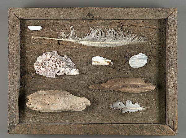 - Title: [Assemblage on Wood Base with Driftwood, Feathers, Stones, and Shells]