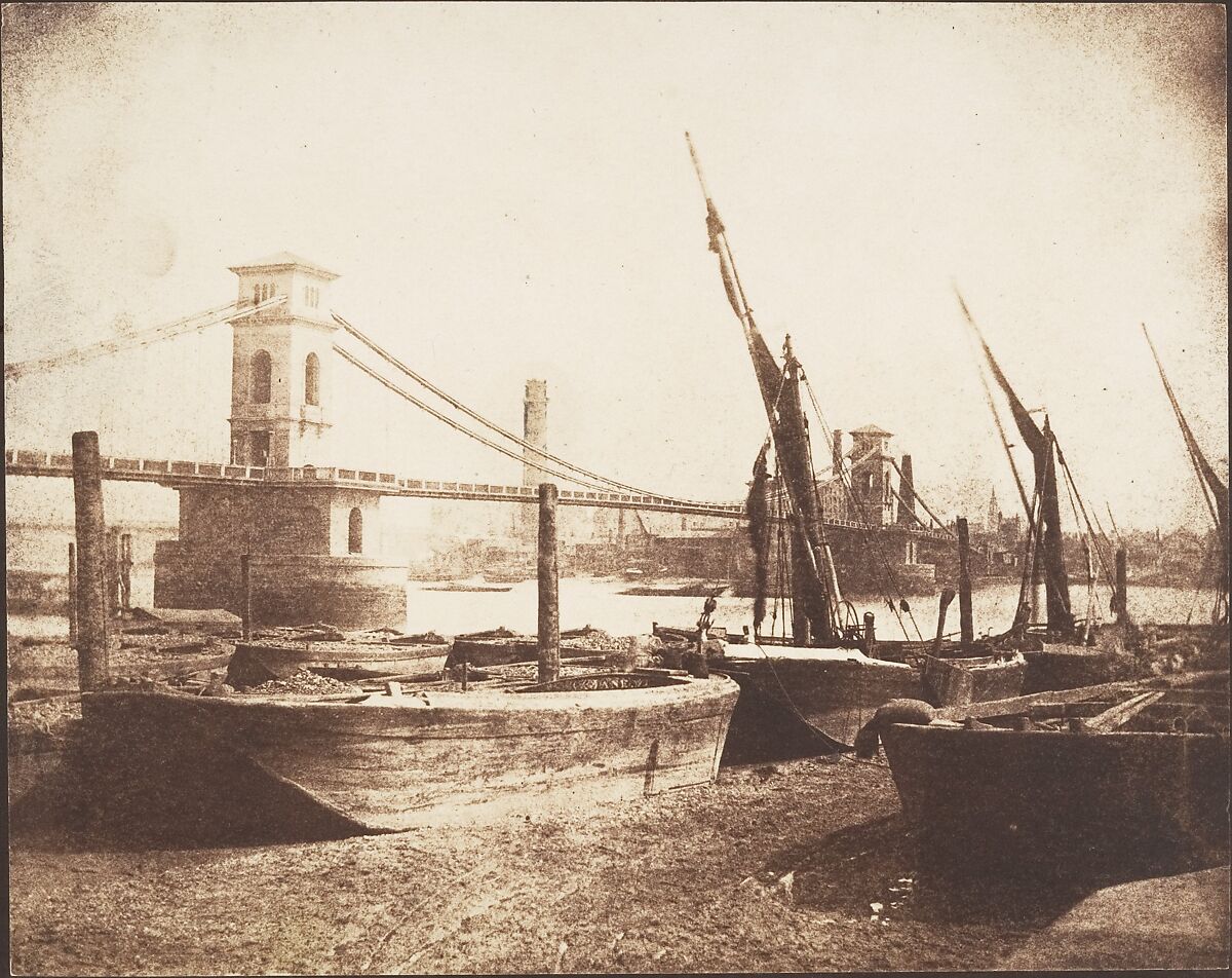 The newly completed Hungerford suspension bridge (1841-45), designed by Isambard Kingdom Brunel (see no. 22), was a powerful sign of Victorian engineering and industry and surely constituted, for Talbot, a dramatic counterpoint in this photograph to the old boats drawn up on the bank of the Thames in the foreground. Only fifteen years after its completion, this bridge was demolished and replaced by the Charing Cross railway bridge. Such was the pace of Victorian technology.