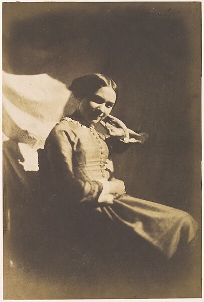 Many of their earliest photographs were portraits of family members, friends, and fellow artisans posed outdoors at Sèvres. In this image we see Robert's daughter, Henriette-Caroline-Victoire, born in 1834. Despite her girlish figure, reduced to a sculptural fragment by the strong light-and-dark contrasts, she seems a woman completely. If she appears both demurely self-protective and openly charming, it is perhaps because she was aware of the presence of both her father and her husband, the painter Emile Van Marcke, who, in another photograph, joins his new wife, leaning into the sunlight behind her chair.