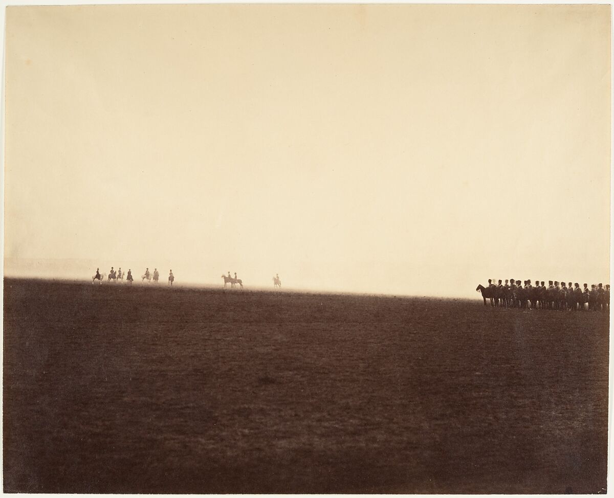 For six weeks in August, September, and October 1857, 25,000 men from the French Imperial Guard, renowned for their victory in the decisive battle of the Crimean War two years earlier, conducted exercises under the command of Napoleon III to inaugurate a vast military camp at Châlons-sur-Marne. Le Gray was commissioned to take photographs of the camp, the inaugural events, and the officers. The pictures were later bound in albums and presented by the emperor to his highest-ranking officers.