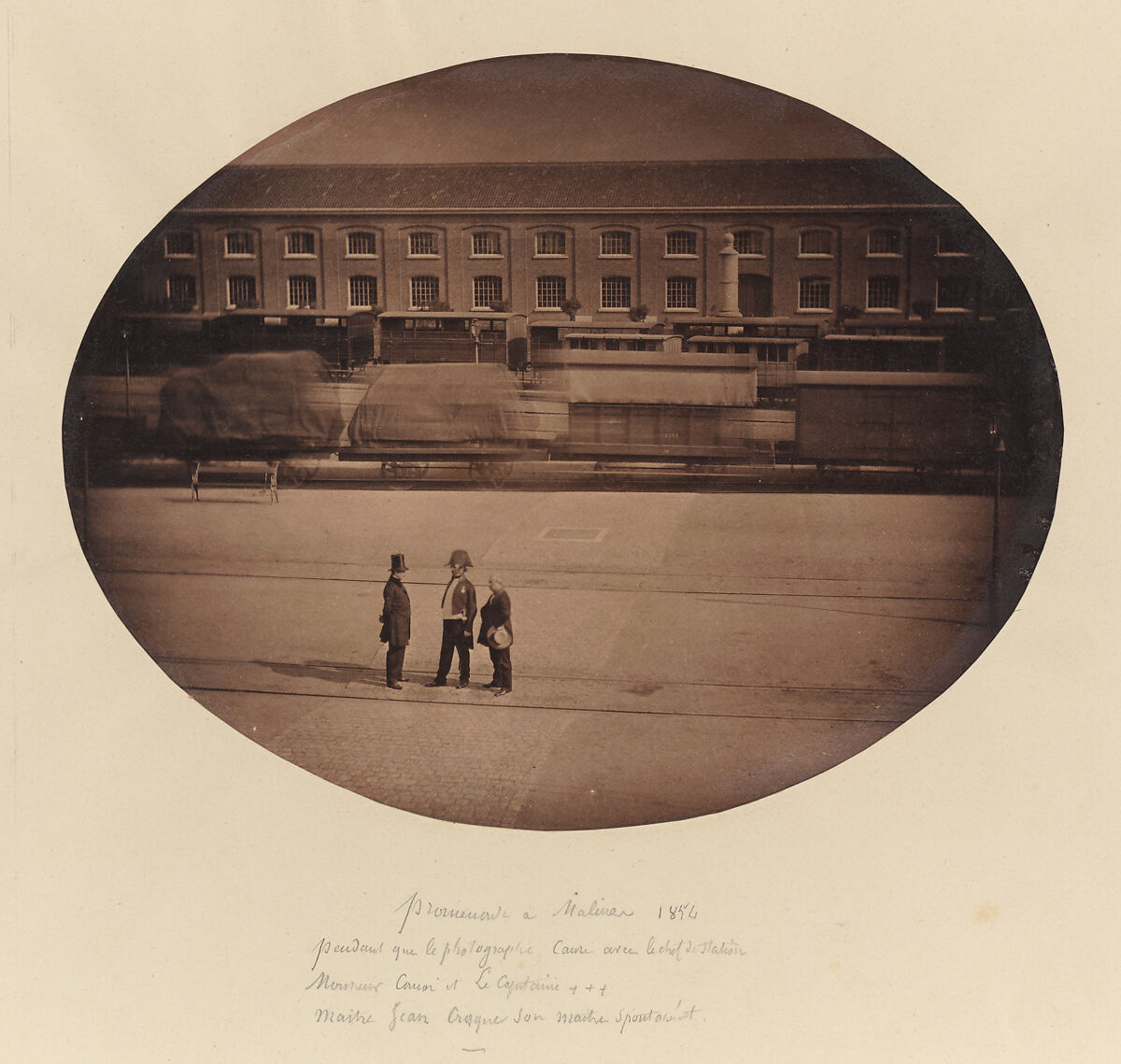 A handwritten note on the mount states that the photograph was in fact taken by Pierre-Jean Maertens, Dubois de Nehaut's servant and photographic assistant. The photographer himself stands, hatless, on the right, conversing with the stationmaster, M. Carion, and an unidentified captain.