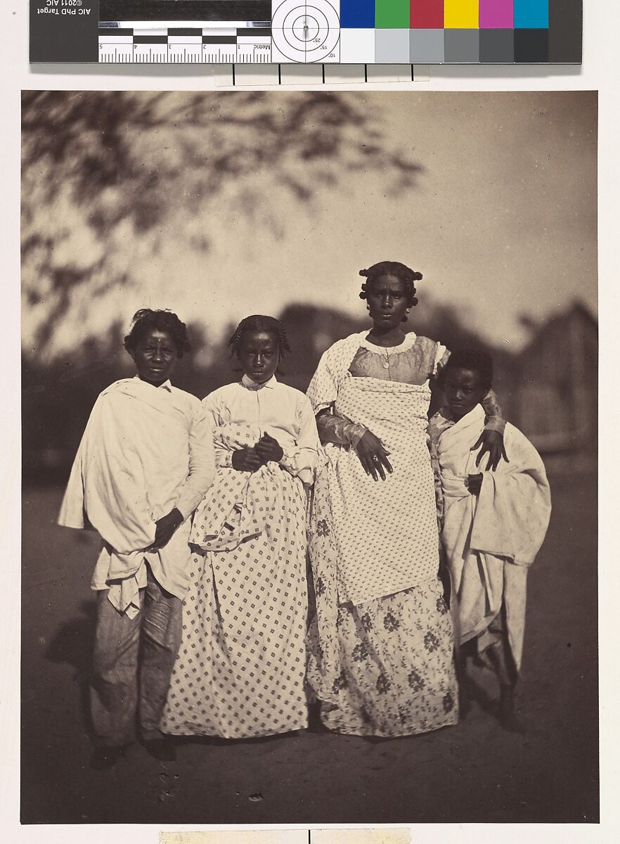 Because of the lack of cooperation he received from the government, run by the Hova, the most powerful ethnic group in Madagascar, Charnay's exploration of the island was limited to a few excursions around the port of Tamatave, on the east coast. This photograph of a Betsimitsaraka family was taken on Nossi-Malaza, the Island of Delights on Lake Nossi-Be, a lagoon south of Tamatave. Charnay noted the warm welcome he received there, the lanky beauty of the women, and the general air of affluence. He described the women's braided hair and their graceful costume: a shoulder wrap, a shirt of silk or cotton, and a long printed skirt imported from India. The woman in the photograph wears such garments, indicative of her high status; her son, on the right, is simply wrapped in a lamba, or cotton shawl, while the young man on the left, wearing pants, shows the European influence. Charnay's directness and clarity of style show to particular advantage in this image, his sympathetic rendering belying his normally more clinical approach. He was obviously drawn by the sitters' composure, the strength of their family bond, and the harmonious ensemble they presented to the camera.