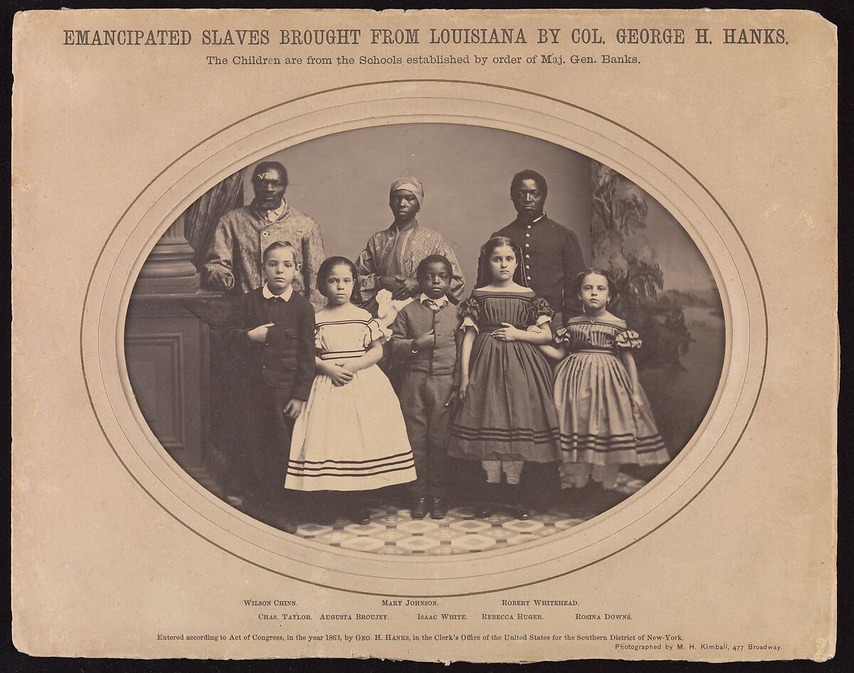 In December 1863, Colonel George Hanks of the 18th Infantry, Corps d'Afrique (a Union corps composed entirely of African-Americans), accompanied eight emancipated slaves from New Orleans to New York and Philadelphia expressly to visit photographic studios. A publicity campaign promoted by Major General Nathaniel Banks of the Department of the Gulf, and by the Freedman's Relief Association of New York, its sole purpose was to raise money to educate former slaves in Louisiana, a state still partially held by the Confederacy. One group portrait, several cartes de visite of pairs of students, and numerous portraits of each student were made.