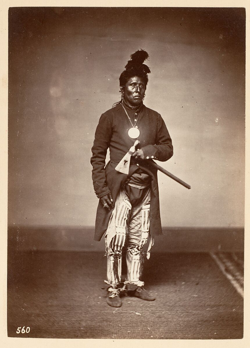 This portrait of Sky Chief (Tirawahut Resaru), a Pawnee, has long been attributed to the frontier photographer William Henry Jackson (1843-1942). Between 1867 and 1869, Jackson acquired two photography studios in Omaha, Nebraska. With one of the businesses, that of Edric Eaton, came a large stock of negatives of Pawnees including the one from which this print was made. Eaton shows the Pawnee chief dressed in a typical late-1860s mix of U.S. military and traditional Native American clothing. Sky Chief, a close ally of the Federal government in its persistent struggle against the Dakota, an enemy of the Pawnee, wears an officer's frock coat with V-shaped cuffs over brightly striped leggings. Around his neck hangs a large, glinting U.S. peace medal, while in his left hand he holds a tomahawk-pipe, a ritual symbol of war and peace.