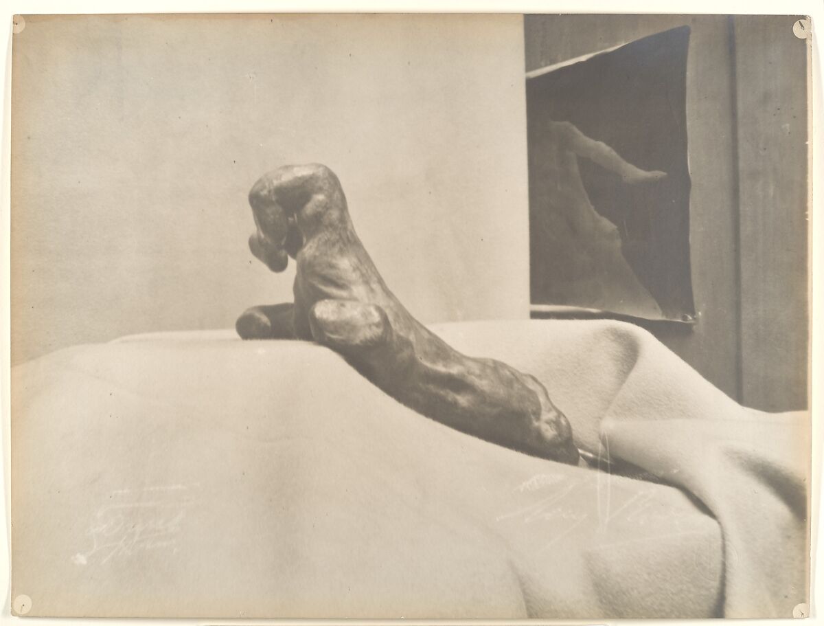 Fascinated by the expressive power of the human hand, Rodin created many works where the hand, as an independent form, becomes a sculptural statement. "The Clenched Hand," made about 1885, is a smallish bronze, 18 1/2 inches in height. The photographs Druet made of it about ten years later are a characteristic, albeit extreme, example of his theatrical, often somber staging of Rodin's sculpture. In the series, the hand seems to emerge from the folds of a white flannel blanket, as if from an invalid's gown. The sculpture's material and subject are sometimes hardly recognizable; this particular image suggested to Rodin and his secretary, René Cheruy, some antediluvian monster crawling over desert sands. That it is also a severed hand in final spasm is suggested by its juxtaposition to a partially visible photograph of another, seemingly amputated, figure waving a deformed limb. This puzzling image within an image is Druet's study of Rodin's "Monument to Victor Hugo." As was customary with Druet, the image of "The Clenched Hand" is an enlargement. The resulting slightly blurred focus and washed-out grayish tint accentuate the unsettling, morbid atmosphere. In its cold light, the image is almost hallucinatory.