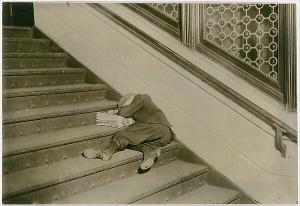 Newspaper sellers, or newsies, fit into the category of street trades, a subject that engendered some of Hine's most lyrical photographs. Although Hine usually recorded the child's age, name, and work habits, he did not disturb this young boy, clearly exhausted from a long day's work. Instead, he captioned the photograph, made in New York City: "A sleeping newsboy found after midnight in the vestibule of a railroad station--newspapers for a pillow." But in fact the picture needs no caption, for the meaning of the scene is clearly stated, the child's hidden face and flattened body a metaphor for all that Hine and the NCLC tried to abolish. Asleep on his unsold goods, the boy is old news, left at the station and forgotten after the departure of the last train.
