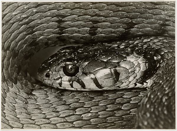 It is, however, an injustice to reduce Renger-Patzsch's aesthetic to a superficial interest in cataloguing the forms of the objects that inhabit our world. Rather, like Weston, his was a search for the underlying essence and universality of those objects. About this image of a grass snake, one of the hundred photographs included in The World Is Beautiful, Carl Georg Heise wrote in the introduction: "The head of the snake fits into the coils of its body in such a way that the page seems filled with a decorative pattern of scales, a pattern which the viewer's imagination extends uncannily into infinity. Thus, above and beyond the single snake, the picture presents the entire species."