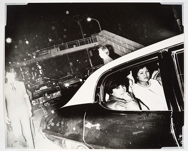 At twenty-one Moriyama moved from his native Osaka to Tokyo, where he internalized the graphic, aggressive style of avant-garde Japanese photographers and Andy Warhol's observations of media culture and consumer society. He was also impressed by William Klein's grainy, haphazard photographic style, which is echoed in this night view of traffic, pedestrians, and a wide-eyed young women startled by his flash in the backseat of an American-style car. Made on the run, this blurred, off-kilter image, exemplifies Moriyama's dynamic, predator-like approach to documenting life in postwar Japan.