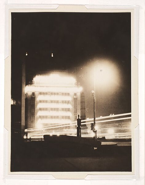 Although the Danish-born architect Knud Lonberg-Holm is relatively unknown as a photographer, his revolutionary images of American cities in the mid-1920s were profoundly influential to the generation of avant-garde photographers active between the two World Wars. This extraordinary night view of the Thomas Cusack Company Building on New York's Madison Square was reproduced in a section of Erich Mendelsohn's landmark book Amerika entitled "World Center—Money Center." Built in 1919 by the young modernist architect Ely Jacques Kahn for a firm specializing in outdoor advertising, the six story building was designed with a façade that allowed for bands of signage beneath the windows and was surmounted by a massive signboard bearing the Cusack Company name. In Lonberg-Holm's futuristic view, floodlights transform the entire structure into a glowing billboard framed by the soft white orb of a streetlight and a diagonal stream of headlights. The effect is otherworldly, recalling the fantastical set designs for Fritz Lang's film Metropolis (1929) and presenting the new American city as an ethereal utopia founded in commerce and existing entirely of light and energy.