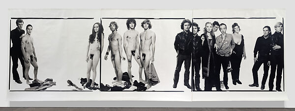 Avedon fantasized about throwing an annual fete for New York society and watching the group evolve over time. This mural is his downtown take on such a party, featuring a new "smart set" of sexual revolutionaries. They were affiliated with Andy Warhol’s Factory, the studio and gathering place for a coterie of avant-garde filmmakers, artists, and socialites. Avedon summoned them to his own studio, where they met over a series of weeks. Working in his most directorial mode, he arranged his subjects—including transgender actress Candy Darling and adult film star Joe Dallesandro—in a lateral frieze across adjoining frames, the fracture and repetition of their bodies in space suggesting the filmic passage of time.