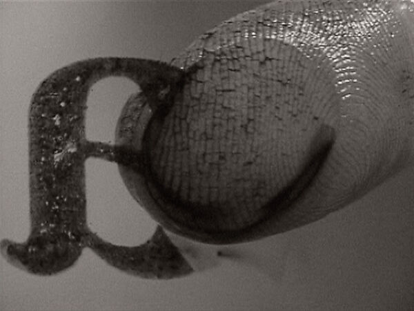 abc was shown opposite one of the artist's "weeping walls" at the 1999/2000 53rd Carnegie International, and shares the same ineffable poetry as these larger, more ephemeral works. In a 26-minute loop, a wetted fingertip slowly erases a backwards alphabet; the amoeba-like form then retraces its path, "writing" the sequence forwards and in correct order. "The camera is following a lens of water," Hamilton has said, "that is the point of contact between finger and glass-it acts as a magnifier." With exquisite economy of means and hypnotic simplicity, the artist compounds modes of visual apprehension (linguistic, photographic) in order to dissolve them into the untranslatable realm of touch. As a work whose beginning is an end and vice versa, abc is also a fitting first foray into the medium of video art at the Metropolitan Museum.