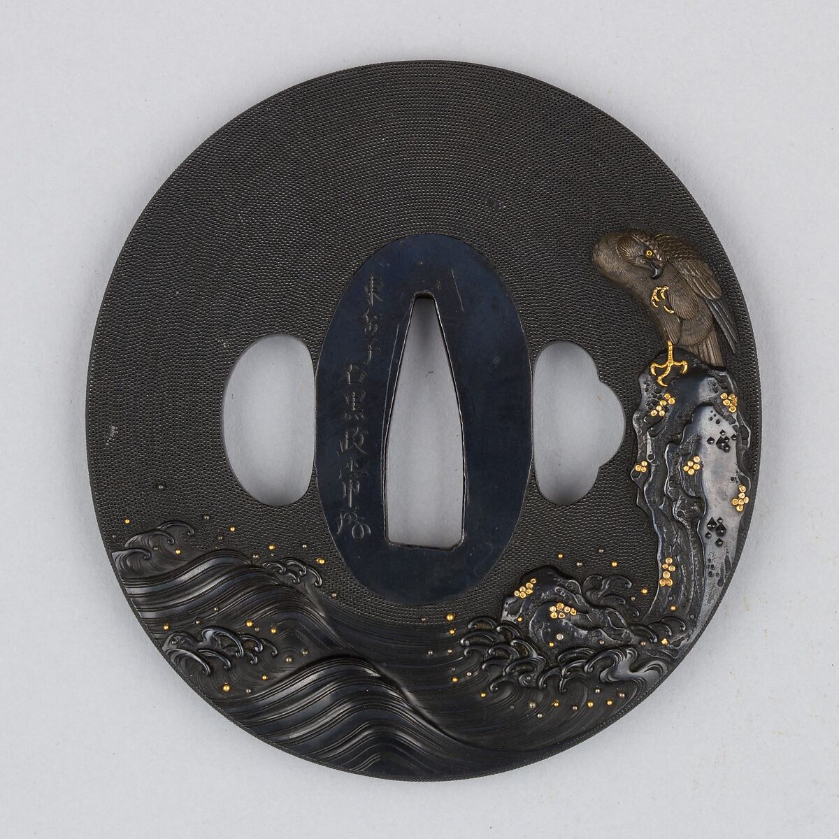 This is the larger guard of a matching pair of sword guards (daishō-tsuba) made by Ishiguro Masatsune (石黒政常, 1760–1828) (pair with 43.120.724). It features a hawk perched on a rock above the sea. The depiction of birds and flowers was the forte of the Ishiguro School, which was established by Masatsune toward the end of the eighteenth century. The solemn character of their interpretations, seen here in the magnificent birds of prey, made Ishiguro works popular among Samurai and elevated the school to one of the most thriving centers of sword-fitting production in Edo (present-day Tokyo).