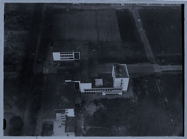 Following the closure of the Weimar Bauhaus in 1925, Walter Gropius relocated the school to Dessau, about one hundred miles southwest of Berlin. This photograph by the balloonist and photographer Robert Petschow records the newly completed Bauhaus. In addition to documenting the building's innovative design--in which classrooms, workshops, studios, a canteen, and Gropius's architectural practice were housed in one continuous structure--Petschow's bird's-eye view reveals aspects of daily life. Tiny figures can be seen on the roof of the studio wing--a flat open space that functioned as social club, dance hall, gymnasium, and sun deck with panoramic views of Dessau, the surrounding countryside, and, overhead on this day, Petschow's balloon.