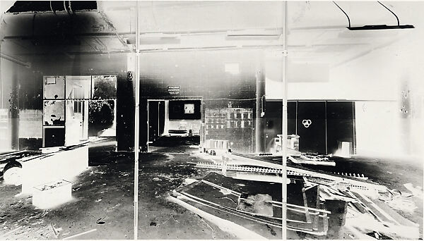 While the basis for Lutter’s technique—the camera obscura—is older than photography itself, her images and subject matter are wholly modern. This enormous negative print was made inside a room-sized pinhole camera that Lutter built in a derelict Pepsi-Cola bottling plant on the East River in Hunters Point, Queens. After pinning three huge sheets of photographic paper opposite the camera’s pinhole aperture, she worked inside the camera to monitor and manipulate the light during the weeklong exposure. The bottling plant itself closed in 1999 and was later demolished.