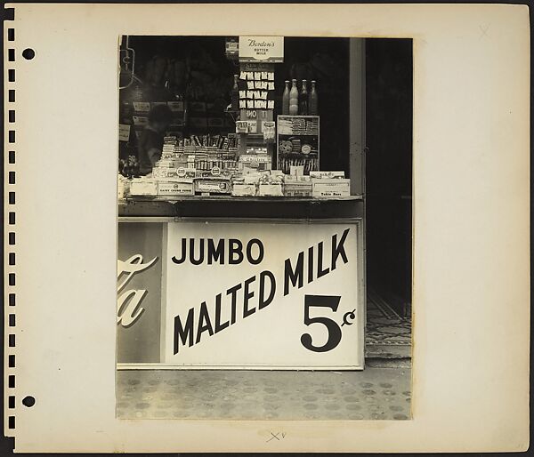 - Title: [Cigar and Candy Stand with Painted Sign "JUMBO MALTED MILK 5¢", New York City]