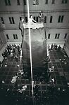These photographs of Kaprow's The Courtyard (1962) were made by Lawrence Shustak, a chronicler of downtown bohemia who happened upon the scene with photographer and darkroom sharer Robert Frank. Composed of discordant noise, circling bicyclists, tires swinging from windows, and showers of spot-lit, glittering tin foil, The Courtyard was a modern-day fable (set in a hotel for transients on Bleecker Street) showing the ascension of a goddess in the guise of a teenage girl, dressed in a nightgown and carrying a transistor radio blaring the latest hits. During the piece, she slowly made her way through the audience and climbed a ladder up a giant mountainlike sculpture in the middle of the courtyard. Striking cheesecake poses for a pair of paparazzi on a mattress (the fan attaining the immortality of the starlet), the girl was then swallowed up by another mountain descending from the rooftop-a deus ex machina for our media age.
