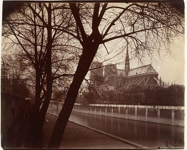 Atget likely avoided Notre Dame during his early career as it was already well documented by other photographers. In his old age, however, he worked more for his own pleasure and during the last five years of his life photographed the cathedral regularly. He always viewed it in an eccentric way—either in the distance, as here, or in detail.