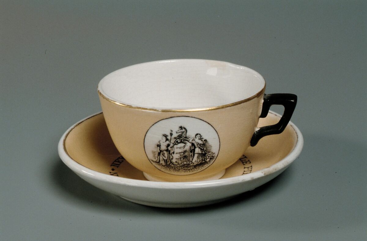 This white earthenware cup and saucer set was made by the Glasgow Pottery Company for the 1876 Centennial exhibition in Philadelphia. The front of the cup is decorated with the arms of the state of New Jersey in circular reserve.