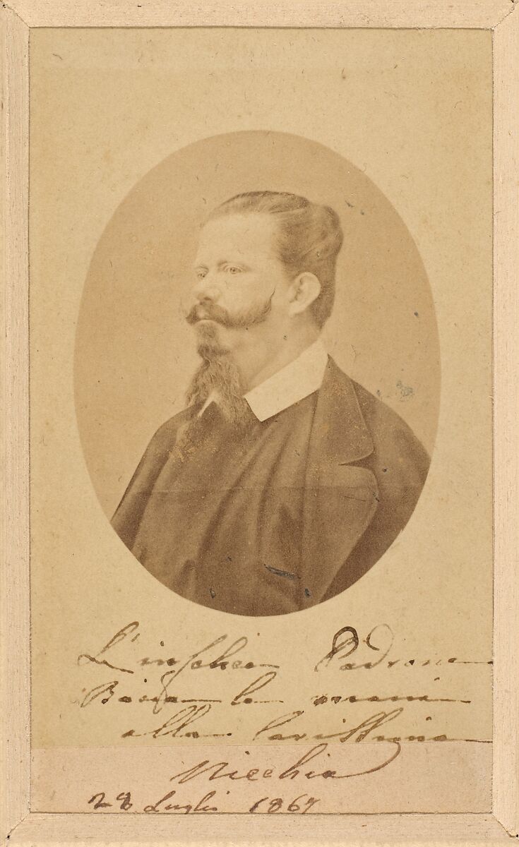 An avowed patriot, Bernieri fought alongside Garibaldi in the Expedition of the Thousand. After establishing his Turin photography studio in 1861, he became known for his portraits of Risorgimento heroes and as court photographer to the Italian royal family. This carte de visite depicts Vittorio Emanuele II (1820–1878), king of Sardinia and Piedmont, who became the first king of a united Italy in 1861. The sitter dedicated this print to the Countess of Castiglione following the tragic death of her husband, writing, “The unhappy sovereign kisses the hands of the dearest Nicchia.”