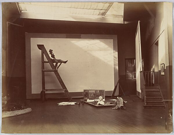 The Parisian photographer and publisher Bénard was known for his series of portraits of artists in their studios. In this strikingly modern-looking image, François Flameng (1856–1923), a painter and professor at the French Academy of Fine Arts, poses jauntily before an oversized blank canvas in his sky-lit studio.