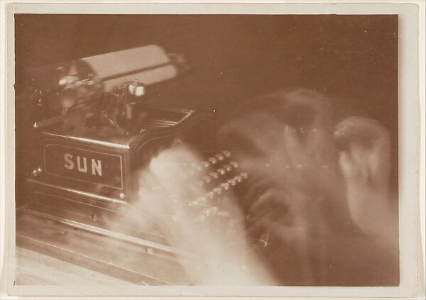 At the age of nineteen, before he began his career as a theater director, set designer, and cinematographer, Bragaglia became greatly influenced by F. T. Marinetti, the founder of the Italian Futurist movement who espoused a love of danger, the beauty of speed, and the interdependence of time and space. Bragaglia soon extended this radically modern position to photography and sought to replace the frozen appearance of an instantaneous snapshot with a projection of the subject's dynamism, or interior essence. To accomplish his aesthetic goals, he left his camera's shutter open to register the absolute fluidity of motion itself-in this case, the fluttering of fingers across the keys of a typewriter. The result is a dissolution or dematerialization of the typist in a seamless picture of active life.
