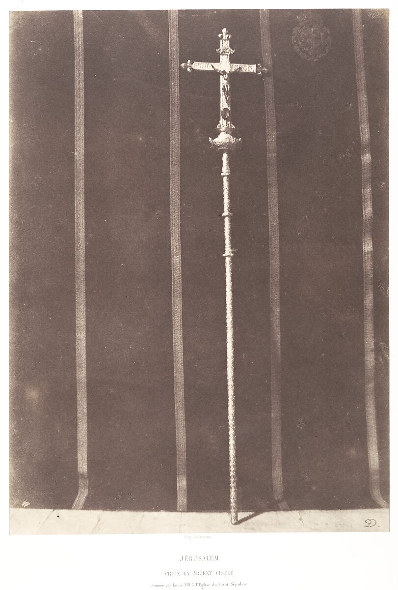 Salzmann revered this processional cross of engraved silver, which the king of France, Louis XIII, gifted to the church treasury in 1625. Placed against a velvety backdrop with a royal seal at top right, the cross is framed by contrasting stripes. Salzmann was eager for viewers to grasp the cross’s detailed workmanship: "The photographic reproduction of this remarkable piece of metalwork, though it was executed in unfavorable light conditions . . . is, however, better than the most minute description." As a capstone to the Holy Sepulchre series, the photograph conveys a sense that the site is rich with a history of French piety.