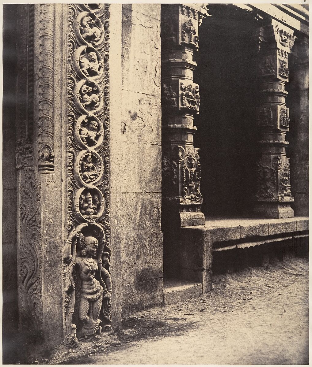 Tripe was a career military officer in India and Government Photographer to the Madras Presidency in the late 1850s. In early 1858 he made an ambitious and difficult tour of India's southern districts in order to create for the government a record of the region's antiquities, scenes of historic importance, and natural phenomena. The subject of this remarkably well-preserved print from a large paper negative is the figurative details carved into the pillars on the gateway of the Meenakshi Sundareshvara temple in Madurai, a city in southern India and an important Hindu pilgrimage site. Tripe noted in his published caption that although the gopuram, or tower, dedicated to Shiva and his consort Meenakshi was unfinished, it was "in no way surpassed in elegance of design and proportion and delicacy of carving." The photograph is from Part I of Photographic Views in Madura (1858).