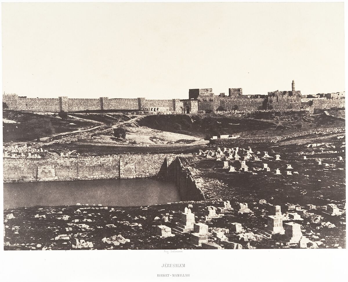 Salzmann’s composition balances the smooth waters of the ancient reservoir known as Birket-Mamillah with the surrounding tombstone-strewn earth. The rich tones of the landscape showcase the strengths of the salted paper print technique. Diffuse yet detailed, the medium was considered the most artistic choice for photographers of the 1850s. Salzmann’s drastic cropping of the reservoir eliminates from view a Mamluk Empire (1250–1517) mausoleum at the left. The compositional choice isolates ancient ruins from more recent structures to better conform the scene to his historical and religious categories.