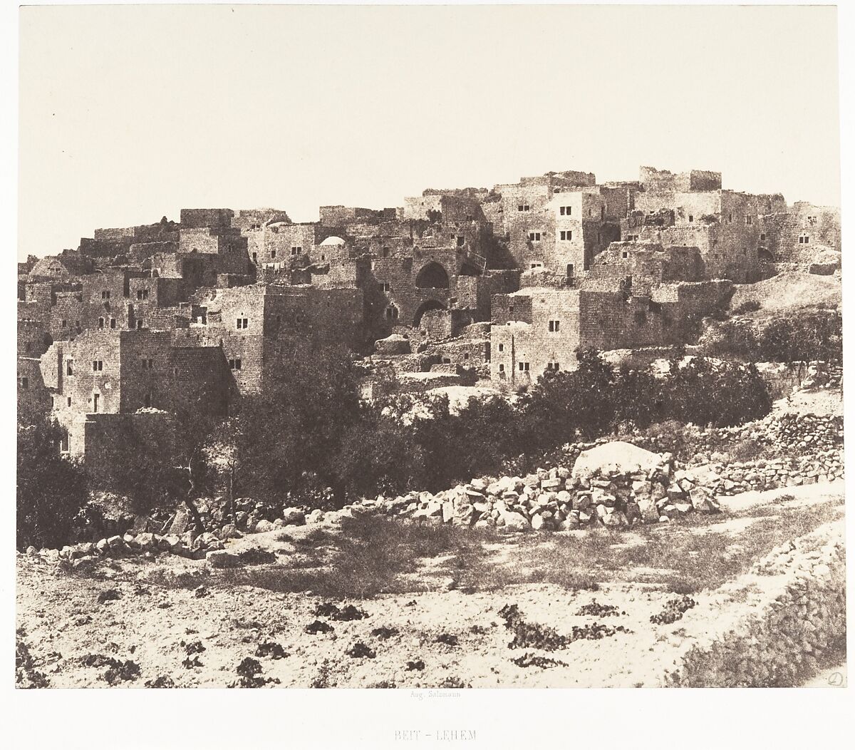 Viewed from afar, the small, dark windows of Bethlehem’s geometric dwellings evoke the words of Salzmann’s countryman, the explorer François-René de Chateaubriand: "This sacred land dares no longer express its joy, and locks within its bosom the recollections of its glory." Other accounts, however, describe a bustling nineteenth-century city that received nearly as many visitors as the much larger Jerusalem. Ignoring the everyday life of Ottoman Palestine, Salzmann presented a vacant, closed land.
