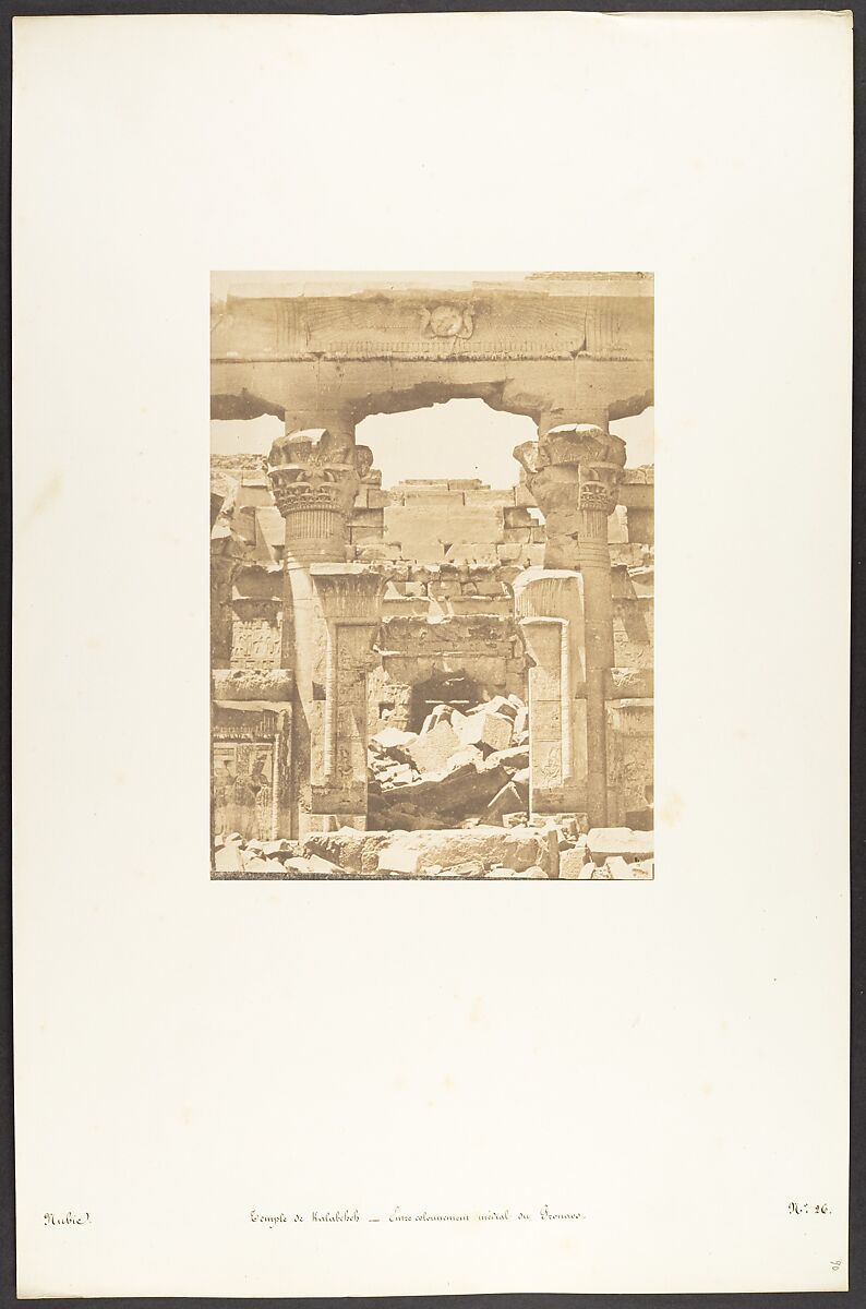 Maxime Du Camp's mission to Egypt and the Near East in 1849-51 to make a photographic survey of monuments and sites is well documented in his writings and in those of his fellow traveler, Gustave Flaubert. After an initial stay in Cairo, the two friends hired a boat to take them up the Nile as far as the second cataract, after which they descended the river at leisure, exploring the archaeological sites along its banks. In July 1850 they left Egypt for Palestine, Turkey, and Greece before they parted in Italy the following April. Du Camp's album "Egypte, Nubie, Palestine et Syrie," published in 1852 and containing 125 photographs printed by Blanquart-Evrard, brought its author instant fame. In addition to the published edition, Du Camp arranged for a private printing of a few portfolios, such as the one in the Gilman collection, which numbers 174 images particularly noteworthy for their warm color and luminescence. Possibly printed in Gustave Le Gray's studio, the present portfolio is