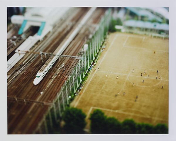 At first glance, this bird's-eye view of Tokyo looks like an image of an obsessively detailed scale model. In fact, it is a photograph of the real world made by tilting and rotating the camera's lens in relation to the picture plane to achieve a very shallow depth of field with selective areas of focus. Honjo is one of a number of contemporary photographers using the "tilt-shift" technique to create disorienting images that seem to straddle reality and the make-believe world of toys. His photographs of Tokyo offer a new view of this postmodern metropolis, accentuating the fantastic artifice of the man-made environment.