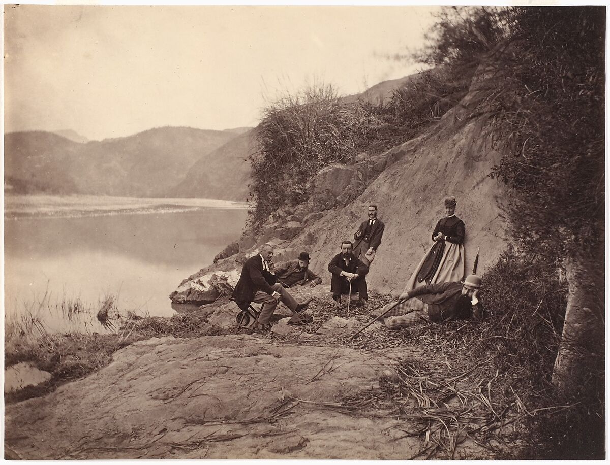 The rather illustrious expedition party included Charles Sinclair, the British Consult of Fuzhou, who sits on the stool at left; Sinclair’s wife, who leans against the rock wall; Baron de Méritens, an Imperial Maritime Customs Service commissioner, who perches on a rock at center; Prosper Giquel, Director of the Fuzhou Arsenal, who stands by Sinclair’s wife; and Francis Temple, an accountant at the Shanghai branch of the Oriental Bank, who is stretched out informally in the foreground. The man adopting a similar pose in the background remains unidentified.