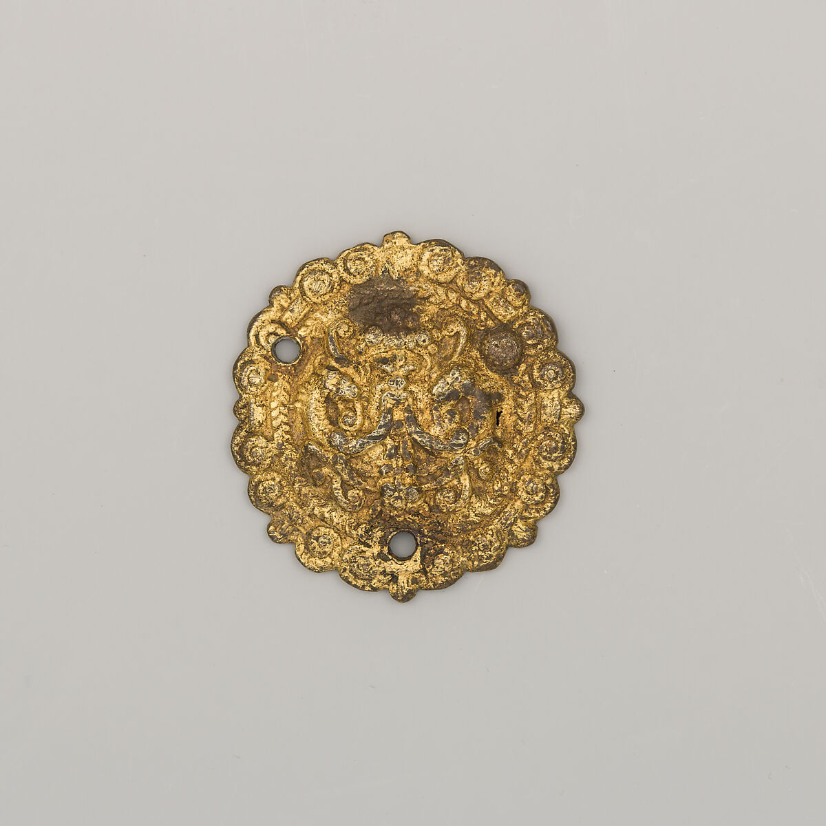 The central part of this bit boss is decorated in low relief with a satyr's mask with two ribbons hanging out of his mouth. He is surrounded by two protomes of monsters with horned lion's heads. The rim, decorated with volutes and a wreath, is pierced for attaching it to the side of a horse bit.