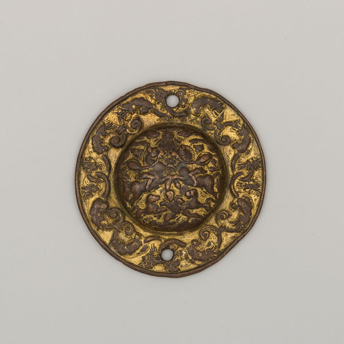 The composition is probably based on a bronze plaquette, The Lion Hunt, made by Moderno (Galeazzo Mondella), ca. 1500 (see 18.70.5). German bronze founders would regularly use Italian medals or plaquettes as models for their works, including bosses, like this one, which decorated the sides of horse bits. They also produced similar decorative elements for powder flasks, staff weapons or even pistols. This Lion Hunt type was among the most popular designs, and could be combined with different types of rims (see also 42.50.163 and 42.50.178).