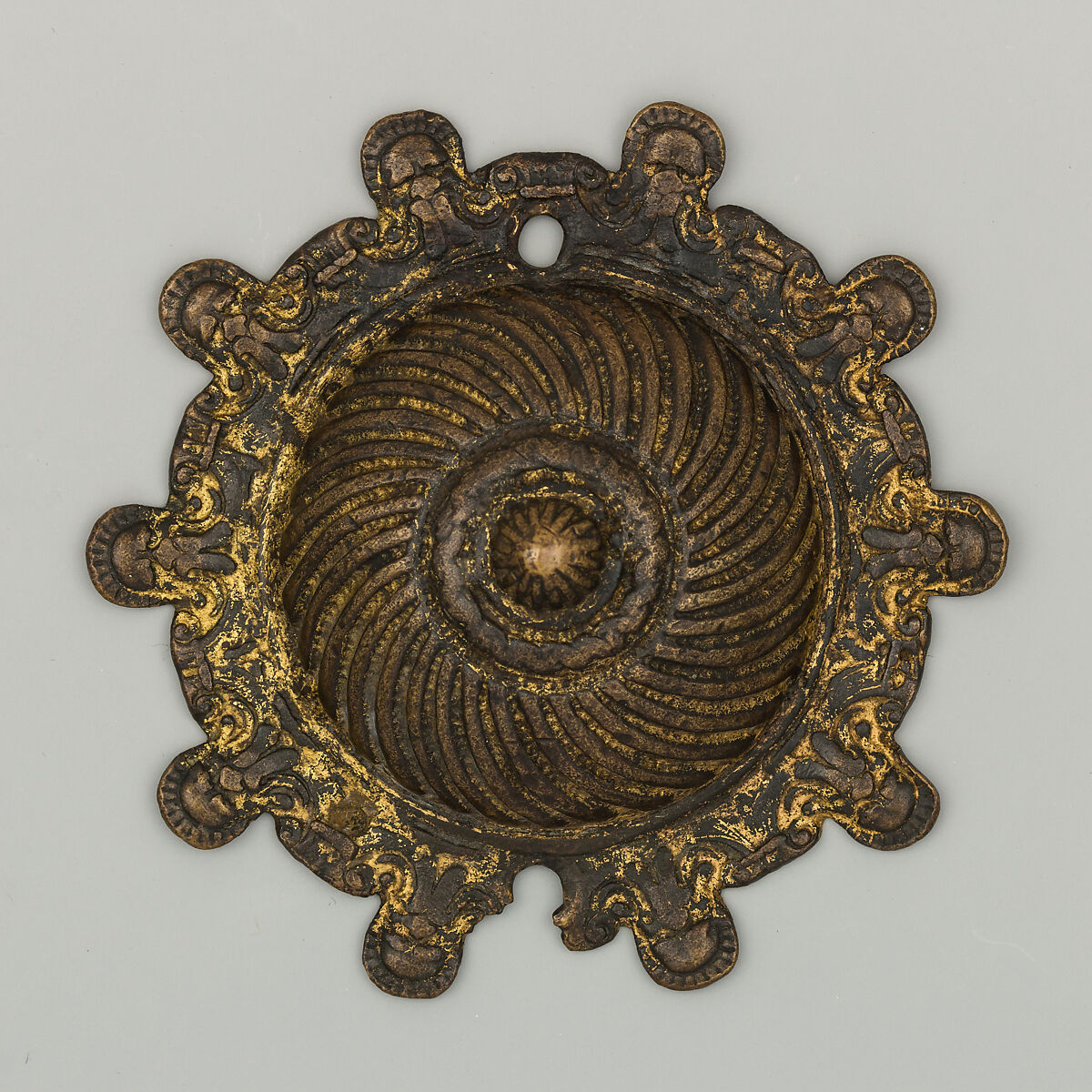This object belongs to a large group of bosses featuring a series of rims and centers combined in different ways. The exact center of production of these bosses is still unclear. If the motifs used are Italian, the scale of the production and the process of combining a series of rims and center recall contemporary German practices. Some of them, however, are identical or very similar to bosses seen in several early 17th-century Netherlandish paintings, a likely origin for the manufacture of these objects.