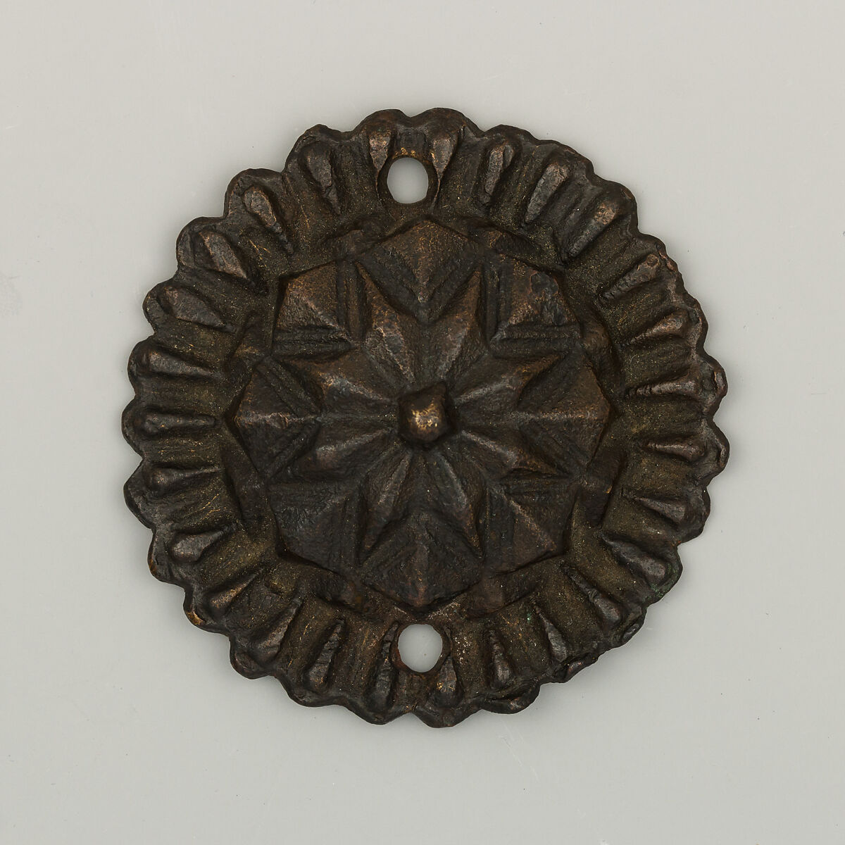 Bit bosses were ornamental elements decorating both sides of a horse bit. This circular bit boss is adorned with a domed faceted center and a serrated rim.