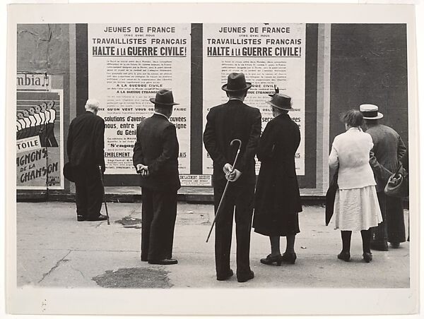 A Swiss-American filmmaker, photographer, and painter, Burckhardt embodied the idea of the flaneur, the passionate spectator of urban life described by French author Charles Baudelaire in the mid-nineteenth century. Like many street photographers of his generation, Burckhardt’s eye gravitated toward popular and commercial signage, which proliferated throughout European and American cities in the early twentieth century. Depicting Parisians reading political posters that implore French youth to join with workers to stave off possible civil war, this photograph provides insight into France’s political tumult in 1930s. Burkhardt later became enmeshed in the New York art world and befriended several artists associated with Abstract Expressionism.