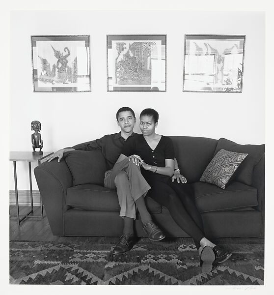 Cook made this portrait of Barack and Michelle Obama at their home in Hyde Park in May 1996 as part of a project on American couples. At the time the photograph was taken, Barack Obama was working as a community organizer and preparing to run for his first term as an Illinois State Senator. What makes this portrait of the pre-Presidential Obamas so compelling today is its naturalness and informality. Seated close together on their sofa, surrounded by art collected on their travels (a small African sculpture and stone temple rubbings), the Obamas project a sense of quiet confidence and humane warmth. They seem connected to the world around them and comfortable with who they are and who they are destined to become.