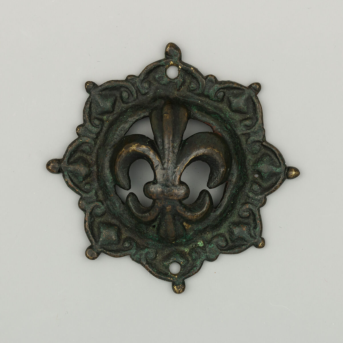 Bit bosses were ornamental elements decorating both sides of a horse bit. The center of these bosses is adorned with an openwork fleur-de-lis circled by a wreath, while the rim displays a frieze of pointed lobes.