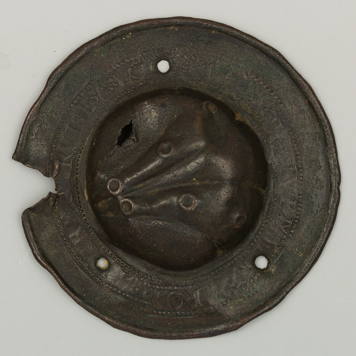 Bit bosses were ornamental elements decorating both sides of a horse bit. This boss, embossed on its center with a stylized scallop, bears stamped on its rim a proverb in French, partly illegible. It belongs to a large group of bosses, some inscribed with proverbs, produced in Northern France or in the Southern Netherlands during the 16th century.