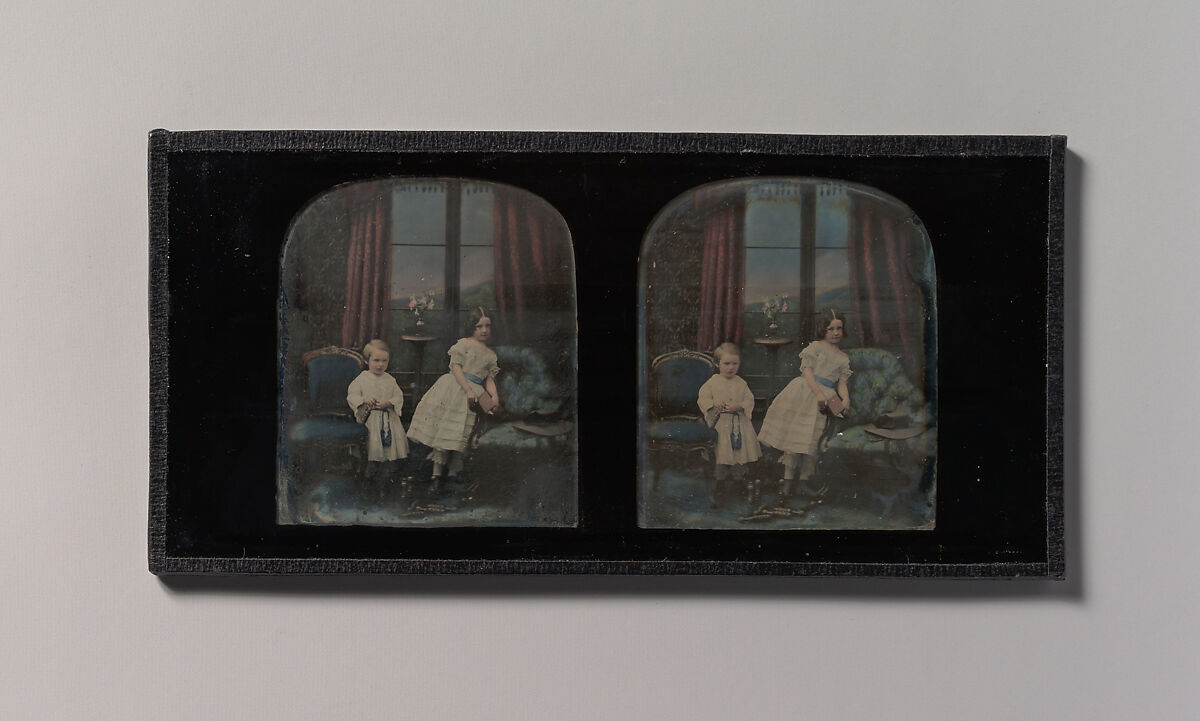 - Title: [Stereograph, Two Children Standing Between Furniture in a Studio Parlor Setting]