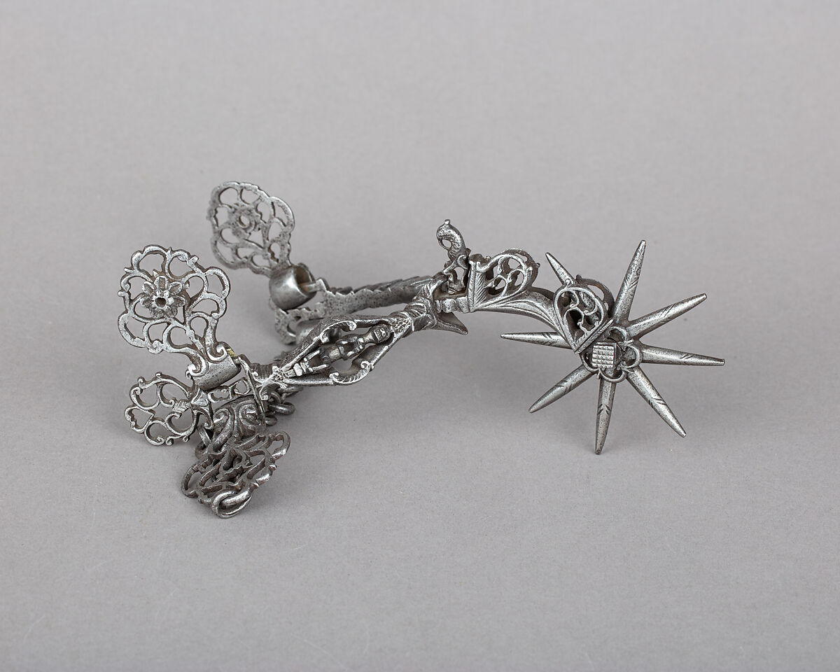 While the pierced decoration is influenced by the importation, via Spain, of horse equipment made in Southern Germany in the 16th and 17th centuries, as well as by Chinese textiles, 18th-century Mexican spurs like this example, in addition to bits and stirrups, often feature native designs and animals, such as birds, dogs, and monkeys.