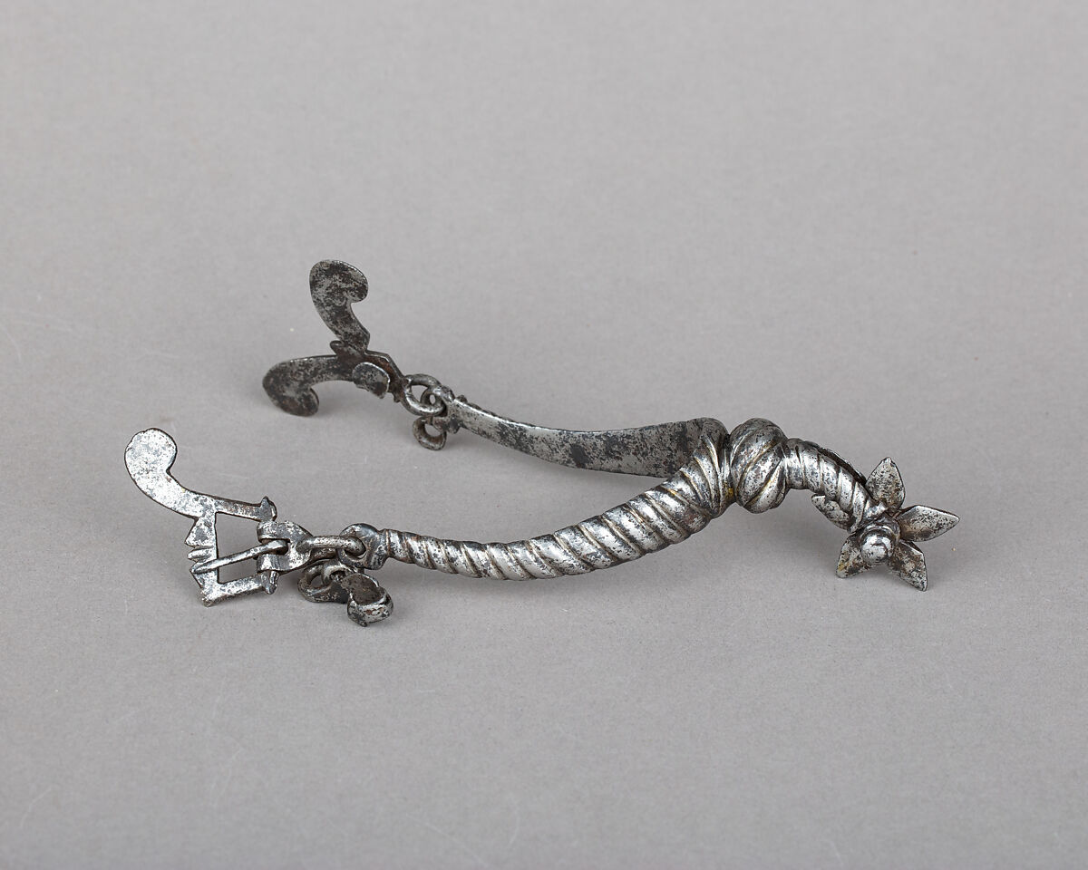 Despite its simple shape this spur is skillfully chiseled all over with a rope motif giving it a particularly sculptural aspect. In the early 17th century spurs became true fashion accessories often worn outside the equestrian context, and some of them were real pieces of jewelry. Even if this spur is simpler and more practical than its luxurious contemporaries, its design gives it enough elegance to align it with this idea.
