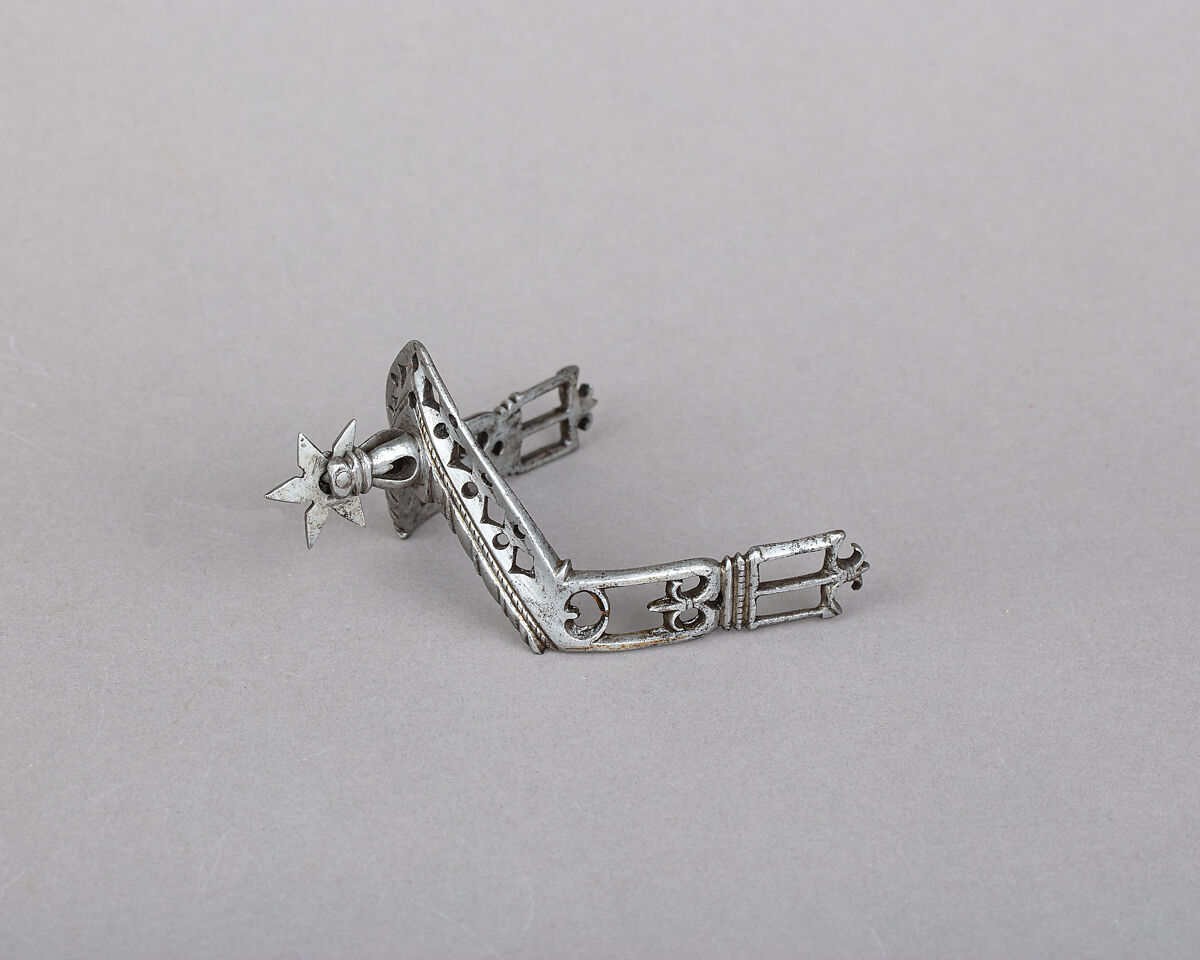 This very peculiar type of spur was produced in Germany around the year 1600. The shape of the branches, with their triangular heel, is very archaic, and recalls Medieval examples. However, the style of decoration of this spur looks slightly different from the regular German production and might have been made in Spain, where a lot of equestrian material was at this time influenced by German and Netherlandish works.