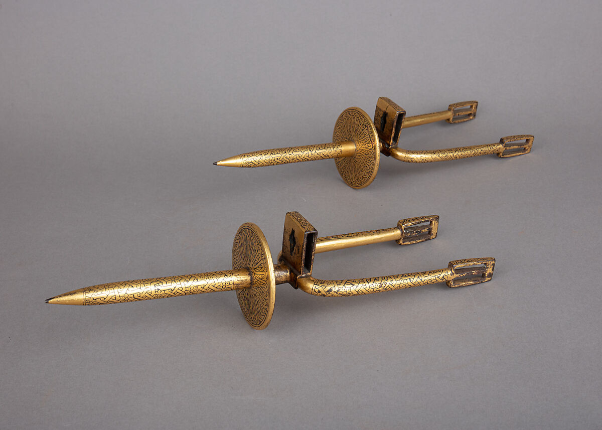 The prick spurs traditionally used in most of the Islamic world evolved directly from late Antique examples. They consist of straight U-shaped branches bearing a very long prick with a disc at its base. The flat loop at the top of the heel is used for attaching the strap going around the ankle. This pair is richly decorated with plated gold, incised with intricate geometrical interlaced bands, typical of Moroccan art.