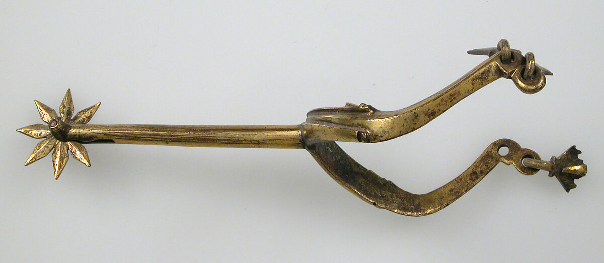 Each of these elegant gilded spurs is subtly decorated with a foliate rowel, and some moldings on the heel and hooks shaped as ivy leaves. In the 15th century, rowel spurs with very long necks were common in Western Europe. During this period, the elevated war saddles and the very specific riding style, with long stirrup leathers and legs extended forward, had the consequence of moving the rider’s feet away from the horse’s flank. Thus, these long-necked spurs allowed the rider to maintain control without having to disturb their position. As a knight’s status was closely related to his horse, spurs became one of the symbols of chivalry, and one of the tokens given to him during his knighting.