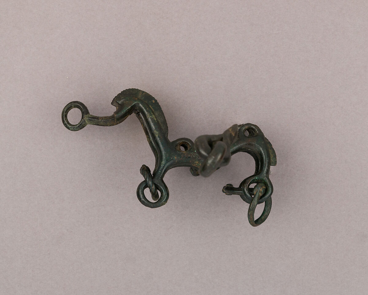 The snaffle bit is the simplest type of horse bit, and has an effect on the bars (part of the horses’ jaw without teeth) and the corners of the lips. The mouthpiece of this bit consists of a single twisted bar terminating in two eyelets, one still holding a fragment of the link for holding the reins. On each side, the mouthpiece passes through a cheekpiece shaped as a horse, featured with two rings on their back for attaching the bit to the bridle. Eyelets on their hooves and noses were used for hanging long decorative pendants, of which a few rings remain.