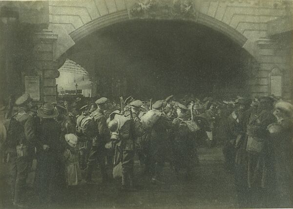 This work of art is currently on loan to the museum.Mortimer, a prominent British Pictorialist, used his darkroom skills to fuel England’s patriotic fervor during World War I. The Gate of Goodbye, his most popular and widely reproduced photograph, depicts war-bound soldiers bidding farewell to their families at London’s Victoria Station. Although such scenes were common during the war years, Mortimer’s photograph is a composite, artfully assembled from more than twenty different negatives—not an outright lie, but an ideologically motivated, aesthetically perfected exaggeration of the truth.